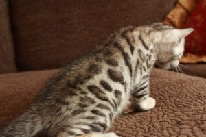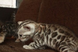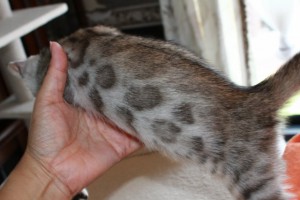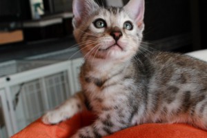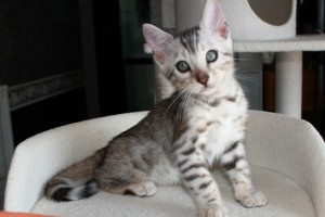 パパはシルバーベンガル ママはブラウンスポットです。 産まれた時は、ほんのりクリーム色のシルバーくんでした。 成長と共に少しずつクリーム色からシルバーになってきていますが、まだ背中にブラウンの毛があります。 1番成長が早く、良く食べ、良く寝て、良く遊ぶ、とにかく元気で甘えん坊な可愛い子です。 スノーの子と、とても仲良く いつも追いかけっこしてジャレて遊んでいます(^^♪